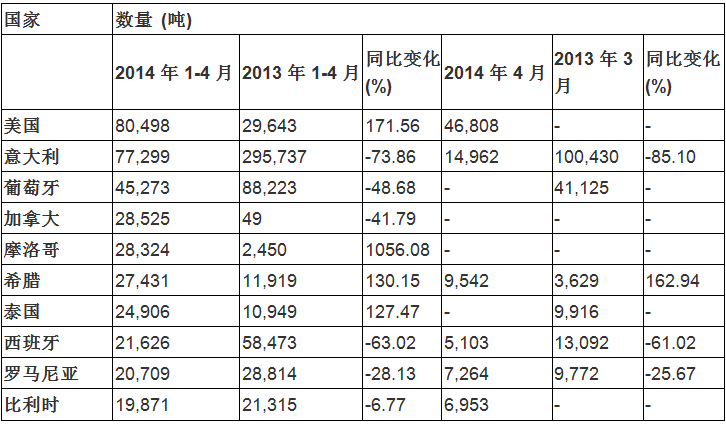 1-4月,美国为土耳其热卷最大的出口目的地,其自土耳其共进口80,498吨热卷,同比增长171.56%。2013年土耳其热卷最大的出口目的地是意大利,但今年1-4月其进口数量为77,299吨,同比下滑73.86%。当期,土耳其热卷出口自葡萄牙的数量为45,273吨,同比下滑48.68%。