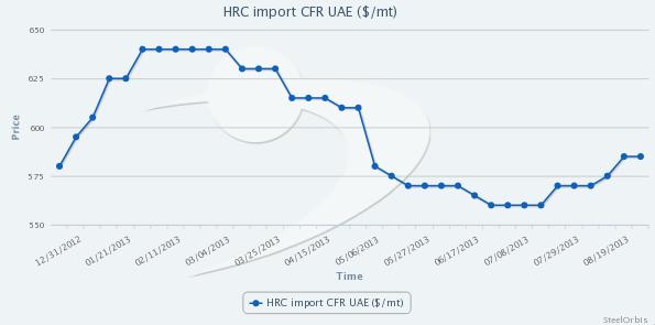 目前,印度、俄罗斯和中国10月份产热卷对阿联酋报价为580-590美元/吨(CFR)。同时,当地经销商所售热浸镀锌卷内销价报820-850美元/吨(出库价),即期发货。