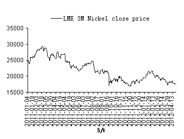 本周镍价仍旧维持震荡盘整,就上周而言仍旧小幅下挫。截止4月24日,LME3月期镍电子盘收盘17490美元/吨,库存略有回升,为99798吨。