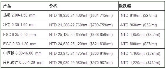 台湾中钢再次下调扁平材价格。8月23日,台湾全流程钢厂中钢集团宣布下调10、11月船期的扁平材售价,最新价格如下: