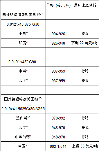 相似的情形也发生在镀铝锌的进口市场,中国钢厂将0.019x41.5625 Gr80/AZ55镀铝锌卷对美国的报价上调了33美元/吨至992-1,014美元/吨,DDP,卡车车板价,美国海湾港。由于该价格太过接近美国国内现货价格,因此也没有获得美国买家的认可。经销商表示中国钢厂很可能会继续坚持涨价,但未来几周是否还会这样坚持就说不准了。印度钢厂也意图抬高镀铝锌对美国的报价。但考虑到任何形式的涨价都不可能长时间的维持,因此此次涨价依旧失败。