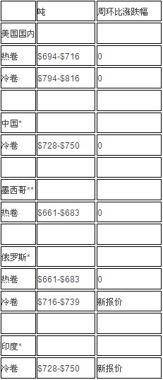目前,国内市场热卷现货价维持在694-716美元/吨(中西部钢厂出厂价),但即便是一些大客户也不得不在顶部价位成交,尤其是一些在交货期有要求的订单。国内市场稳健也带动了进口市场。目前,墨西哥和俄罗斯热卷报价维持在一周前的水平上,但本月初很大一部分订单都在底部价位成交。同时,俄罗斯冷卷对美国报价已经低于美国国内市场价,其报价在716-739美元/吨(DDP,卡车车板价,美国海湾港),引人侧目,但这样的低价还是面临中国资源的竞争,后者报价高出11美元/吨。
