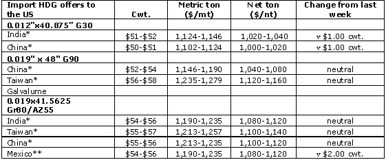 自4月初以来,部分进口热浸镀锌报价跌幅高达110美元/吨,由此国内买家对进口热浸镀锌和镀铝锌资源的采购兴致持续高涨。目前,印度和中国出口的0.012"x40.875" G30热浸镀锌对美国报价在1123-1146美元/吨和1102-1124美元/吨(完税后交货,卡车车板价,美国海湾港),继上周周环比下跌44-66美元/吨之后,本周报价较上周均下跌了22美元/吨,