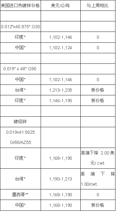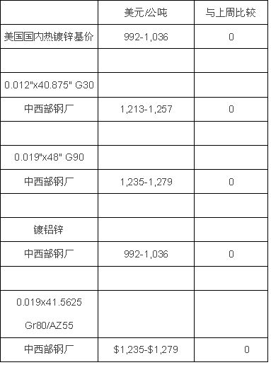 美国热镀锌厂想从价格上来夺回其市场份额。尽管热镀锌和镀铝锌的现货价格与前一周持平,在992-1036美元/吨,中西部钢厂出厂价,但据了解,几天前有交易达成,价格是在992美元/吨以下。