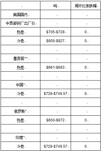 上周,美国AK钢公司宣布其将上调扁平材现货价55美元/吨,但有消息称,买家未必会接受这一涨价。鉴于当前处于需求淡季,此举或许只是给市场注入强心剂,为钢厂在年度供货合同谈判中增加筹码。不过,这并未改变市场当前态势,许多人屏住呼吸观望其他大型钢厂例如牛克是否会尾随其后进行相应调价,这样会给AK钢公司的调涨动作增加一点助力。目前,美国扁平材市场处于停滞状态,现货价格与上周持平。目前,热卷价格维持在705-728美元/吨(中西部钢厂出厂价),冷卷现货价为805-827美元/吨(中西部钢厂出厂价)。