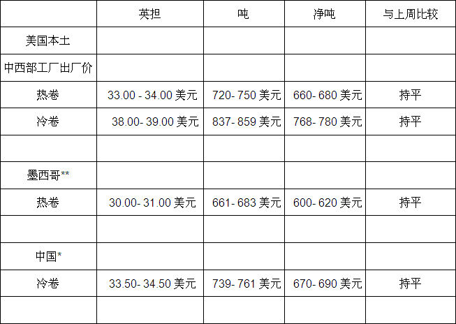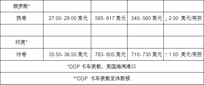 美国本土报价持稳,但自印度进口冷卷报价及自俄罗斯进口热卷报价有所波动。为争取更多买家,俄罗斯热卷报价下滑2美元/英担(44美元/吨或40美元/净吨),至27-28美元/英担(595-617美元/吨或540-560美元/净吨),DDP卡车装载,美国海湾港。另一方面,印度冷卷报价上涨1美元/英担(22美元/吨或20美元/净吨),至35.5-36.5美元/英担(783-805美元/吨或710-730美元/净吨),DDP卡车装载,美国海湾港。另外,中国冷卷和墨西哥热卷报价持稳。