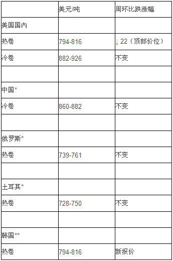 美国国内市场的上行趋势于一周前结束,钢厂为了填补轧制日程的空缺,采取灵活的价格政策,交易活动再度贫乏起来。SteelOrbis全球钢铁网由经销商获悉,良好的需求水平不足以抵消由较高生产率,2月废钢价格下滑和未来两个月进口资源到货带来的下行压力。在之前一周,热卷现货价格顶部价位下跌22美元/吨,至794-816美元/吨(中西部钢厂出厂价),冷卷现货价格仍位于882-926美元/吨(中西部钢厂出厂价),然而,多数交易以底部价位达成。