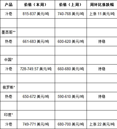 美国国内钢厂上调报价的行为推动了本周扁平材市场价格上行。AK Steel本周宣布,扁平材现货价格将至少上涨55美元/吨。紧随其后,安塞乐米塔尔,US Steel和纽柯都将价格上调55美元/吨。