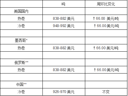 尽管美国国内扁平材市场的采购活动普遍放缓,现货价格自我们一周前的报道上升了大约66美元/吨。