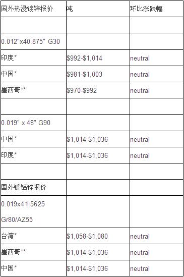在持续了两周的跌势之后,美国进口市场上热浸镀锌和镀铝锌报价依然摇摇欲坠。近几个月来,美国进口市场成交十分低迷,主要还是因为国内价格走势不明朗;同时,远东地区成品材需求平淡,从而导致中国大陆与台湾地区钢厂将更多的资源倾往美国。不过,近两周平均进口价格下跌11-44美元/吨未能带来成交的大幅上升。