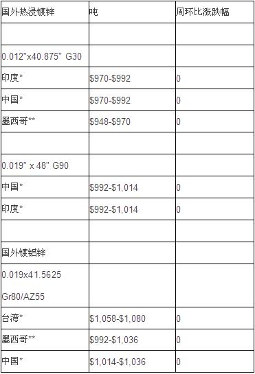 据经销商预测,一旦期货价到达所谓的底部或美国国内市场现货价趋稳,那么订单量就会井喷;届时,经销商和潜在买家都有可能伺机以待。同时,墨西哥方面也急切争取订单,由于相对海外订单墨西哥供应商交货期短,因此墨西哥订单还是相当看好。目前,墨西哥0.012"x40.875" G30热浸镀锌对美国报价为948-970美元/吨(DDP,卡车车板价,美国海湾港)。
