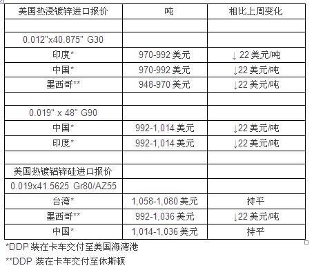 至少未来几周内,进口价格将会继续降低,特别是因为远东地区需求依然不旺。墨西哥对美国的出口报价也折射出美国内销市场的降价趋势。自上周以来墨西哥0.012"x40.875" G30对美国出口报价下跌22美元/吨,降至948-970美元/吨,DDP装在卡车运至休斯顿。墨西哥热镀锌铝硅价格下跌22美元/吨,目前价格维持在992-1,036美元/吨,DDP装在卡车运至休斯顿。但是大多数交易活动在高端完成,较大订单报价为992美元/吨。