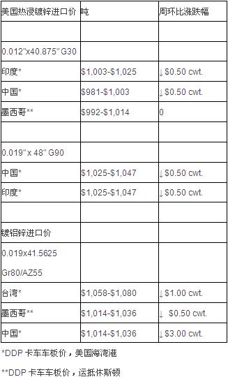 在基本保持平稳数个月之后,美国热浸镀锌和镀铝锌进口价格双双下跌,预计后期还有下滑空间;近日许多进口买家开始转向国内供应商下手采购。前周早些时候,中国钢厂将对美国市场的热浸镀锌报价进行下调,调整幅度为10美元/吨,到了周末时再下调5美元/吨,但经销商表示这样的幅度不足以提高成交量。另外,印度钢厂也将报价下调了相同幅度,中印售价较一周前均下跌了11美元/吨。