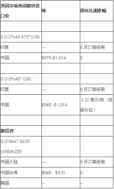进口方面,印度暂不对外报价,其8月份订单已宣告停止。不过,9月份印度热浸镀锌报价将在不久后开始。很有趣的是,近期中国供应商来势汹汹,据业内分析,中国供应商给美国国内经销商的压力不小,宣称"要么现在采购,要么等到下周我们提价后再采购"。