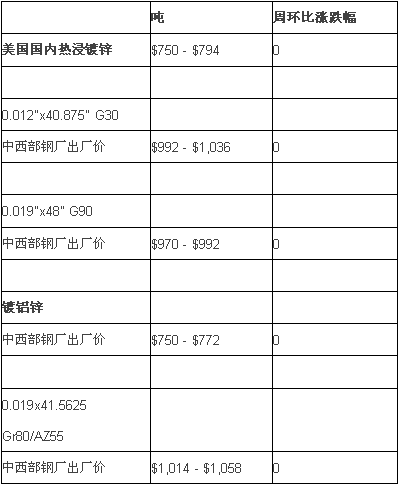 一周以来,美国国内市场热浸镀锌价格跟随冷热板卷走势,维持了一周的平稳态势,买家和服务中心纷纷忙碌于对库存高低的控制中。