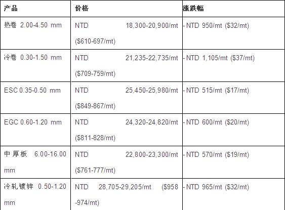 5月30日,台湾全流程钢厂中钢集团下调7、8月产扁平材价,新价格如下:
