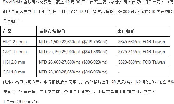 台湾中鸿钢铁出台扁平材本土及出口价格