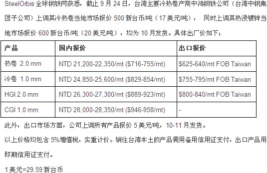 台湾中鸿钢铁公布扁平材本地及出口报价