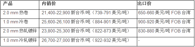 国内市场方面,目前,台湾中鸿钢铁公司6月份交货冷热卷价格较上月下跌1,600新台币/吨(55美元/吨),冷热轧镀锌价格下跌1,700新台币/吨(59美元/吨)。同时,出口方面,中鸿钢铁公司冷热卷价格较上月下调了50美元/吨,热轧镀锌价格较上月下跌了20美元/吨。