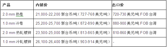 国内市场方面,目前,台湾中鸿钢铁公司6月份交货冷热卷价格分别较上月下跌了400新台币/吨(14美元/吨)和400-700新台币/吨(14-24美元/吨),而冷热轧镀锌价格分别较上月下跌了600新台币/吨(21美元/吨)和300新台币/吨(10美元/吨)。同时,出口方面,中鸿钢铁公司热卷价格较上月下跌了30美元/吨,冷卷和热轧镀锌价格跌幅为20美元/吨。