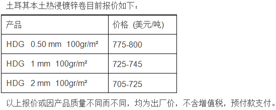市场消息称,土耳其本土热浸镀锌市场需求有小幅改善,但实际需求实质性改善还言之尚早。市场参与人员认为,在上周价格上涨后未现疲弱,需求或将继续改善。