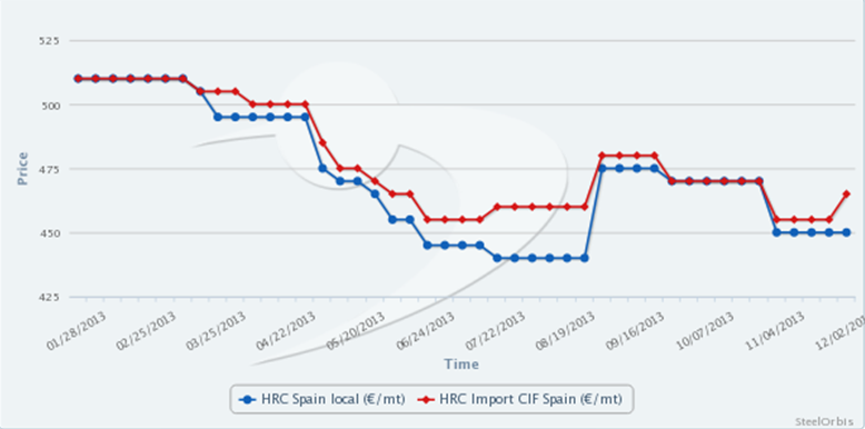 西班牙本土热卷报于450-470欧元/吨(612-639美元/吨),本土冷卷和热浸镀锌卷报于530-540欧元/吨(721-734美元/吨)。以上价格均为出厂价,12月生产。
