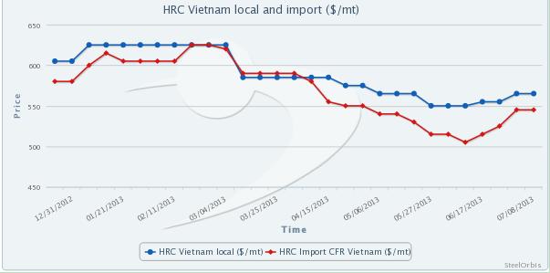 在国内扁平材市场需求低迷的同时,中国扁平材对越南报价近几周持续攀升;而当地价格在前周也开始出现上涨,并在上周维持稳定态势,摆脱进口市场涨势的影响。斋月前夕的涨价或被市场跌势和人们日益累积的忧虑所替代。目前,越南国内市场热卷售价为560-565美元/吨(出库价),较两周前上涨10美元/吨;冷卷价格为680-685美元/吨(出厂价),较两周前上涨5美元/吨。同时,2 mm厚度再轧热卷售价为570-575美元/吨(出库价),较两周前上涨15美元/吨。