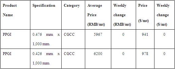 本周中国彩涂板卷价格趋于平稳,市场销售压力依旧,贸易商观望气氛较为浓厚。各主要市场的均价变化情况如下表所示($1=¥6.34):