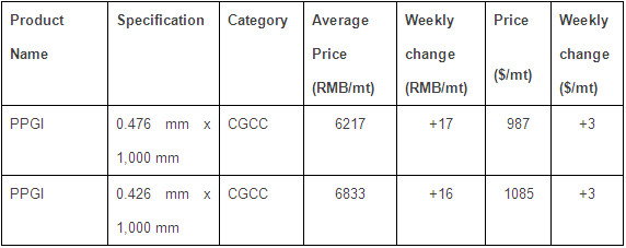 本周中国彩涂市场稳中有涨,其中上涨行情主要体现在广州市场,上海和博兴市场均保持平稳运行。各地市场均价的变化情况如下表所示($1=¥6.30):