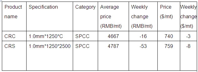综上所述,目前市场需求面仍无改观,价格上行的阻力较大,预计下周中国冷轧板卷市场仍将持续弱势盘整走势。