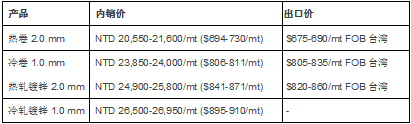 SteelOrbis全球钢铁网获悉,截止5月29日,台湾全流程钢铁产商中钢集团旗下主要冷热轧再轧商中鸿钢铁公司决定将6月交货期的扁平材出厂价保持不变,具体如下: