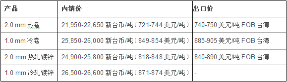 国内方面,10月交货的热卷价格涨幅为500新台币/吨(16美元/吨),冷卷价涨幅为500新台币/吨(16美元/吨),冷轧镀锌价涨幅为600新台币/吨(20美元/吨)。