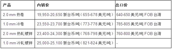 关于国内市场方面,中鸿钢铁公司12月份热卷价格较上月下跌1800新台币/吨(59美元/吨);冷卷价格下跌2000新台币/吨(66美元/吨),冷轧镀锌价格下跌1500新台币/吨(49美元/吨)。至于出口方面,中鸿钢铁公司热卷和冷卷价格较上月下跌了80-90美元/吨。