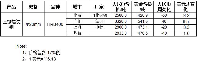 首页 > 国际钢价 > 钢铁价格和市场分析 > 长材及方坯 > 螺纹钢...