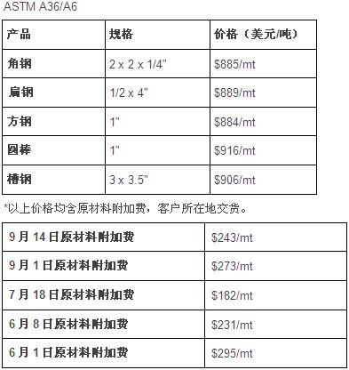 纽柯集团本周四晚些时候宣布,所有9月14日起发货的中小型材和结构钢订单原材料附加费将调整为243美元/吨,较9月1日下降31美元/吨。
