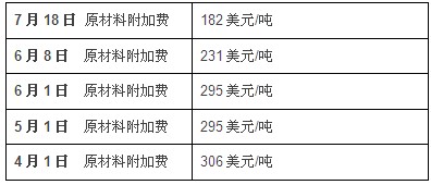 本月,此类产品的原材料附加费下调182美元/吨,相比6月8日公布的价格相比,下跌50美元/吨。