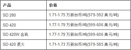 同时,台湾当地市场螺纹钢售价相比上周上涨了100新台币/吨(3美元/吨),目前的具体价格如下: