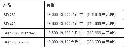与上周相比,台湾螺纹钢内销报价下跌100-200台币/吨(3-7美元/吨)。目前价格水平如下所示: