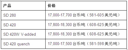 同期,与上周相比,台湾螺纹钢内销价格下跌200-600台币/吨(7-20美元/吨)。价格水平如下所示: