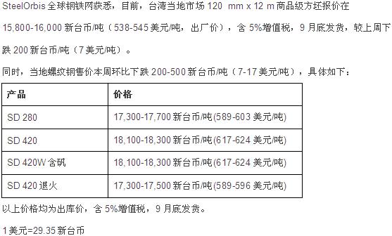 台湾市场方坯和螺纹钢价格行情