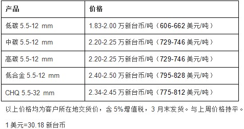 首页 > 国际钢价 > 钢铁价格和市场分析 > 长材及方坯 > 台湾线...
