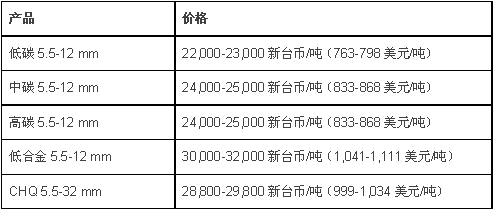 以上价格均为到库价,含5%增值税,7月初发货。其中,CHQ线材价格均较上周上涨300新台币/吨(10美元/吨),其他品种价格保持不变。