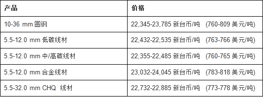 台湾中钢集团12月发货的圆钢和线材价格维持在11月份的水平。 具体价格如下: