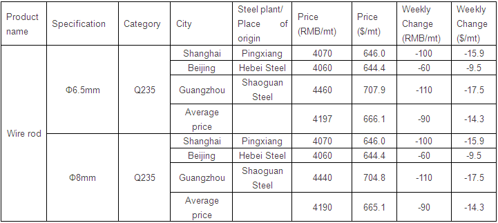 近期中国持续低温和多雨天气阻碍了工地开工,延缓了建筑钢材的需求复苏步伐,了无成交的市场打压了参与者的信心。随着钢厂发货量增加,商家多以降价出售,导致整个钢材市场价格明显下滑。目前市场库存量有所增加,成交难以回暖,预计下周国内市场建材价格继续弱势回调。