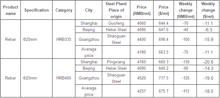 本周我国主要地区建筑钢材价格跌幅较大,华东和华南地区建材价格下跌尤为明显,并且市场成交较差。截止2月13日,上海期货交易所螺纹钢期货1205合约收盘4261元/吨(676$/t)。