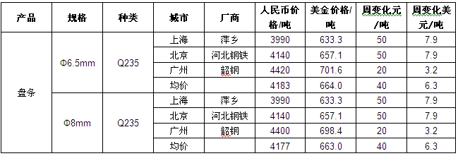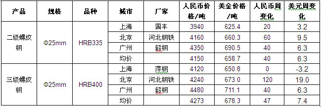 截至发稿,国内三级螺纹钢均价678.3美元/吨,周环比上涨7.4美元/吨,二级螺纹钢均价658.7美元/吨,周环比上涨6.3美元/吨,Ф8mm高线均价663美元/吨,较上周环比上涨6.3美元。