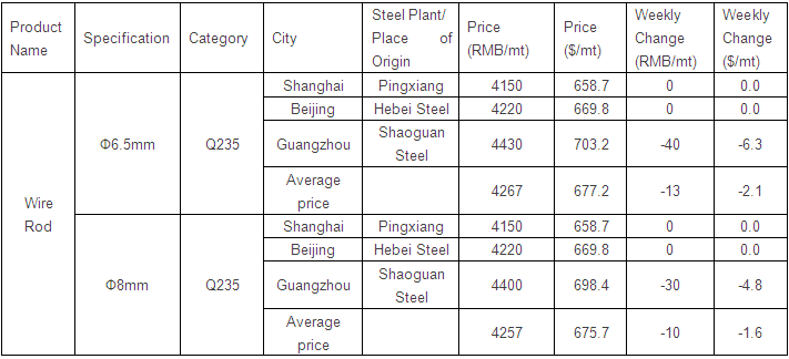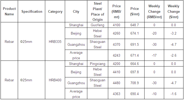 本周建筑钢材价格总体呈弱势震荡走势,华南地区建材小幅,而华北和华东地区相对稳定。截止3月26日,上海期货交易所螺纹钢期货1210合约收盘4354元/吨(691$/t)。
