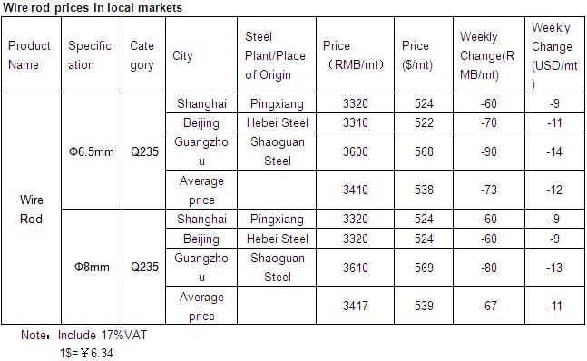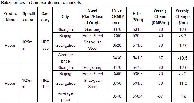 上周建筑钢材仍旧没有企稳的苗头,尤其是前半周其价格跌势凶猛。截至发稿,国内三级螺纹钢均价558.4美元/吨;Ф8mm高线均价539美元/吨,周环比分别下滑8.9和11美元。上海期货交易所螺纹钢期货1301合约9月10日收报529美元/吨。(1$=¥6.34)