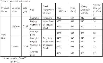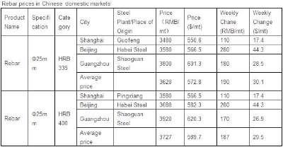 上周建筑钢材呈反弹走势,尤其是本周一价格大幅拉升,河北地区部分贸易商报价上涨超过200元($40)。截至发稿,国内三级螺纹钢主要城市均价589.7美元/吨;Ф8mm高线均价568美元/吨,周环比分别涨29.5和27美元。上海期货交易所螺纹钢期货1301合约9月17日收报529美元/吨。(1$=¥6.32)