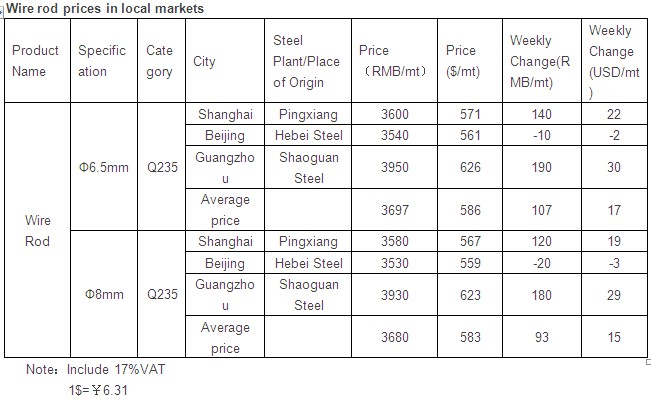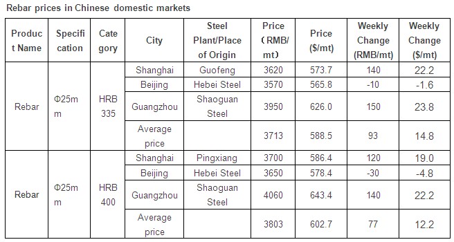 华北地区的建筑钢材价格在上周暴涨之后,需要消化价格暴涨带来的一些负面情绪,这是该地区价格调整的主要原因。而华南和华东地区建材价格的继续上涨则是一种连续的相对平稳的上涨状态。在近两周的时间里,建材价格反弹幅度达到300元(约为$45-$50),市场参与者心态逐渐趋于理性,预计建筑钢材价格趋于调整的概率加大。
